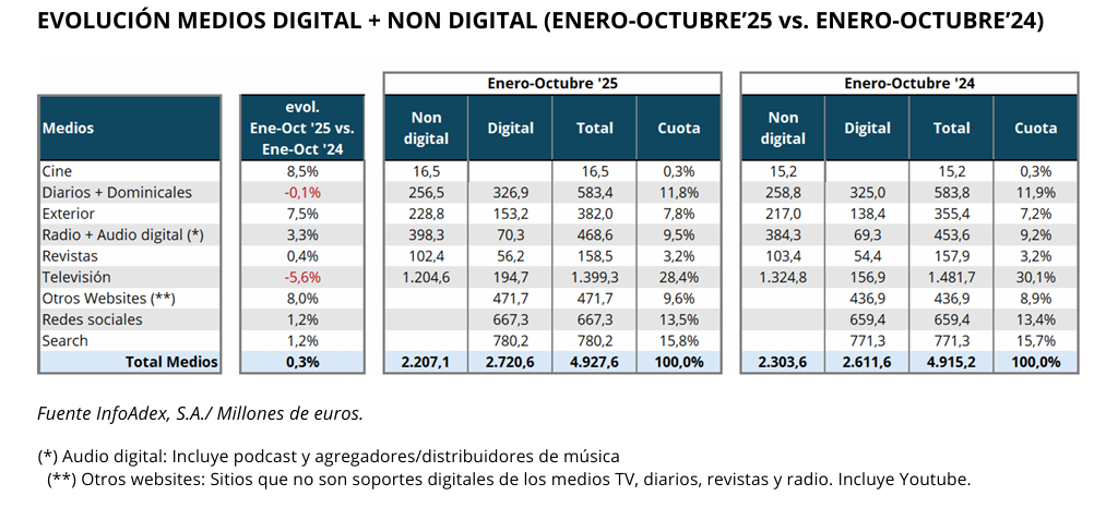En el acumulado de enero a octubre, la inversión total alcanza los 4.927,6 millones de euros, lo que supone un avance del 0,3% frente al mismo periodo de 2024. Televisión continúa liderando con 1.399,3 millones invertidos (28,4% del mercado), pese a su caída del 5,6%. Search (780,2 millones) y Redes Sociales (667,3 millones) mantienen crecimientos leves del 1,2%, consolidándose como pilares de la planificación digital. Diarios + Dominicales permanecen prácticamente estables (-0,1%), mientras que Otros Websites registran un incremento notable del 8%, alcanzando los 471,7 millones.