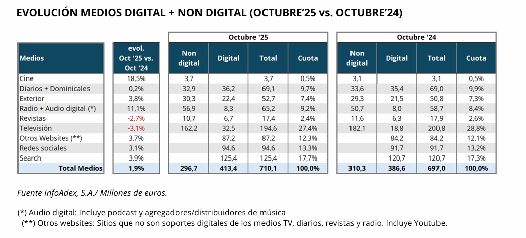 La inversión publicitaria en España alcanzó en octubre de 2025 los 710,1 millones de euros, un 1,9% más que en el mismo mes del año anterior. El impulso procede principalmente de medios como cine, exterior, radio + audio digital, otros websites, redes sociales y search, según los datos de InfoAdex, que continúan reflejando la transición del mercado hacia entornos cada vez más digitales y diversificados