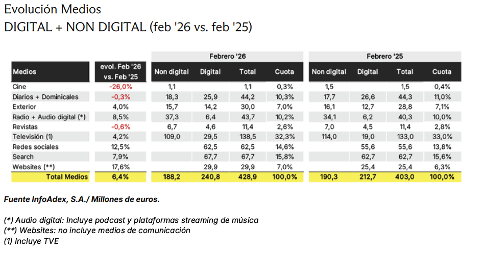 El mercado publicitario español continúa su senda de crecimiento en 2026. Según los últimos datos publicados por InfoAdex, la inversión publicitaria alcanzó los 428,9 millones de euros en febrero, lo que supone un incremento del 6,4% respecto al mismo mes del año anterior, cuando se registraron 403 millones de euros. Este avance refleja una evolución positiva del sector, apoyada tanto en medios tradicionales como, especialmente, en el impulso del ecosistema digital.