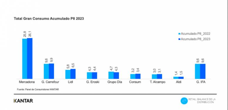 Lidl alcanza una cuota de 6,5%, lo que supone 0,6 puntos más que el año pasado y se convierte en la cadena que más crece, según el informe “Balance de la distribución” de Kantar Worldpanel, que analiza el periodo enero-agosto de 2023.