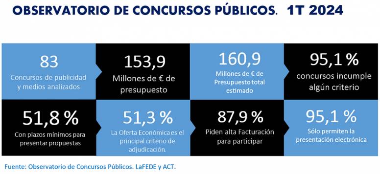 Así lo revela el Observatorio de los Concursos Públicos de Publicidad del primer trimestre de 2024, creado por Asociación de Empresas de la Comunicación (La FEDE) y La Asociación de Agencias de Creatividad Transformadora (ACT)