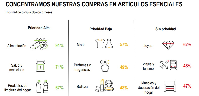 Sin embargo, en estos tres últimos meses, los consumidores han distinguido entre prioridad alta y baja para realizar sus compras. Los shoppers han declarado una prioridad alta para adquirir categorías como alimentación (91%), salud y medicinas (71%) y productos de limpieza del hogar (67%). Frente a una tendencia hacia lo esencial, hay menos protagonismo a compras más emocionales que pasan a ser de prioridad baja como moda (57%), perfumes y fragancias (49%) y belleza (48%).