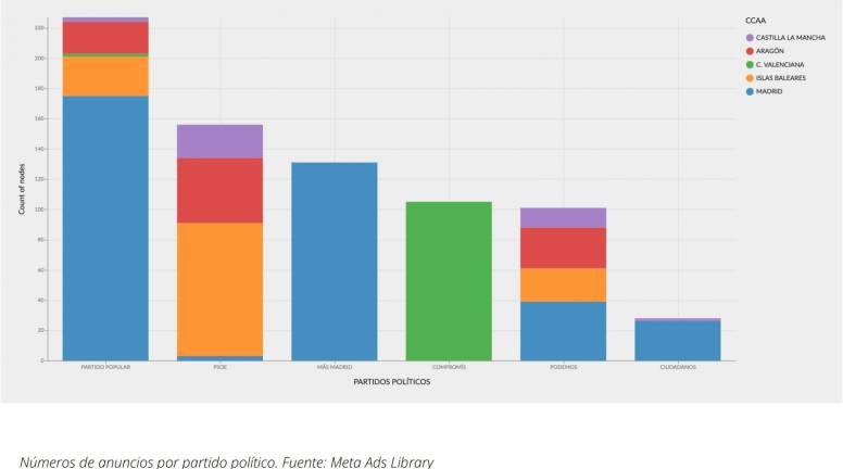 El PSOE, en segundo puesto por número de anuncios realizados, ha apostado por llegar al electorado de las comunidades donde mantiene su liderazgo, especialmente en las Islas Baleares. Podemos, por su parte, ha centrado sus esfuerzos en la Comunidad de Madrid, sin que haya logrado entrar en la Asamblea regional. Por último, Ciudadanos, uno de los partidos que menos ha invertido en publicidad digital en esta campaña, se ha centrado en Madrid y Castilla LaMancha.