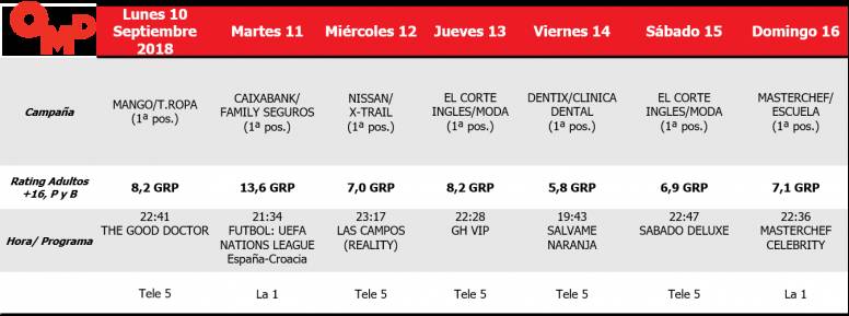 La exhibición de la Selección Española ante Croacia en la "UEFA Nations League" alcanza con 13.6 Grp's el Spot de Oro Semanal en la campaña de Caixabank/Family Seguros, según OMD/Kantar. Además, la cadena pública vuelve a conseguir el mejor rating publicitario el domingo con "MasterChef Celebrity", que lidera el día confirmando su gran acogida por parte de la audiencia.Telecinco domina el resto de la semana. “The Good Doctor” continúa anotando el spot de oro del lunes mientras que el mundo del corazón otorga a la cadena de Mediaset el del miércoles, con el cambio de look de las Campos en su propio reality y el del jueves con un espectacular arranque de la 6º edición de “GH VIP” que, además ,retroalimenta el resto del programas de la cadena. La polémica con Chabelita en la casa y la llamada de Isabel Pantoja elevan el dato de “Sálvame” en su edición diaria y en la del prime time con el “Deluxe” consiguiendo los spots de oro del viernes y del sábado.