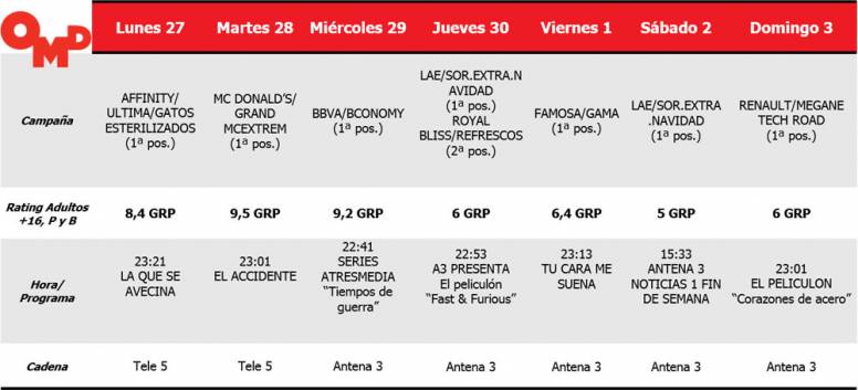 Antena 3 es la cadena protagonista de esta semana, dominando el spot diario desde el miércoles al domingo con diferentes géneros. El miércoles es en el bloque de entrada a su serie “Tiempos de guerra “ quien lidera el día, mientras que el jueves y el domingo lo consigue gracias al cine. El viernes es su exitoso talent show “Tu cara me suena”, quien logra ganar el prime time a “La Voz”. El sábado sorprende que no sea el habitual programa de noche quien se lleve el spot de oro sino que es el informativo de Antena 3, “Antena 3 Noticias 1 Fin de Semana”.