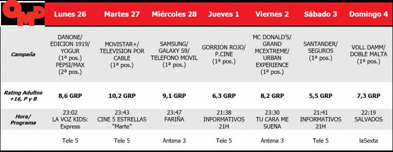 En esta semana a caballo entre febrero y marzo, se produjo una fuerte lucha entre las dos grandes cadenas privadas por ganar el mes, sacando el martes y miércoles toda su artillería. Según el informe semanal de OMD-Kantar, Tele 5 ganó febrero por 31 centésimas y se adjudicó cuatro spots de oro, entre ellos el del jueves y el del sábado en sus Informativos de noche. Su apuesta del martes con el “Cine 5 estrellas” para vencer a su rival, la serie “Cuerpo de élite” de Antena 3, fue todo un acierto con la película “Marte” que no solo fue lo más visto del día, sino que proporcionó el spot de oro semanal con 10,2 Grp’s a la campaña Movistar+/Televisión por cable.