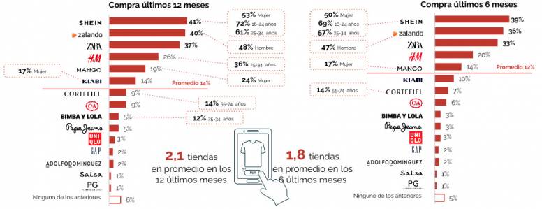 Trend Seekers (42%). Buscan las marcas que ofrecen las últimas tendencias en moda, así como buenos precios. Este perfil, está formado mayoritariamente por mujeres con una media de 39 años. En general, es un perfil muy activo en internet y en redes sociales, por lo que el ordenador y el móvil son los dispositivos favoritos para realizar sus compras. El ticket medio de este perfil es de 80€, siendo superior a la media y con mayor tipologías de productos de moda. Zara y Shein son las tiendas de referencia para este perfil que prefiere comprar en tienda física, por lo que valoran que las marcas tengan venta offline y online.