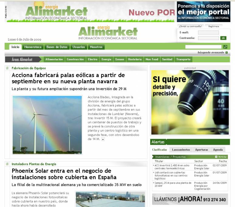 Alimarket, editorial especializada en información económica sectorial, lanza un nuevo portal de información económica sobre energía, especialmente centrado en energías renovables y alternativas. Se trata del primer portal que lanza la editora sin vinculación con ninguna publicación en papel.