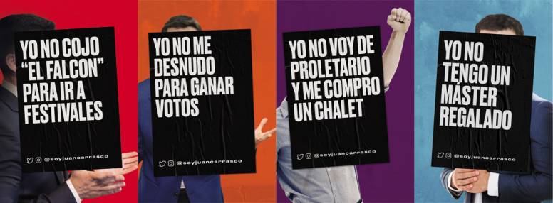 Como única pista, todos los carteles aparecían firmados con la dirección de Twitter e Instagram de un personaje desconocido, Juan Carrasco, cuyos perfiles en redes sociales se acompañaban de la siguiente leyenda: ‘Este país está al borde del precipicio y necesita a alguien que dé un paso adelante’. Que, en el caso de Twitter, añadía además el lema ‘Este país necesita un cambio de verdad’, encabezando su perfil.