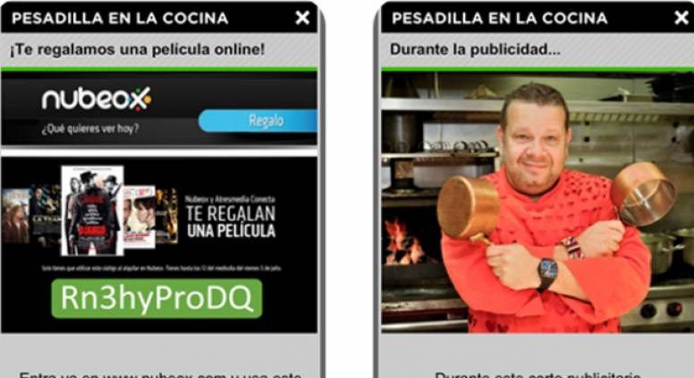 En una primera fase, cuya finalidad era la convocatoria a la acción, se emitieron distintas piezas en televisión que invitaban a interactuar con la aplicación así y obtener de manera gratuita una película de estreno del videoclub online Nubeox. Como refuerzo de la acción, en las redes sociales se también se incentivó la participación en el programa. La segunda fase se desarrolló durante la emisión del programa “Pesadilla en la cocina” de la Sexta, donde se emitió un spot de Nubeox durante el corte publicitario en Televisión, mientras, de manera simultánea, se emitía un hito publicitario de esta marca en Atresmedia Conecta (ofreciéndole al espectador una promoción para descargar de manera gratuita a una película de estreno).