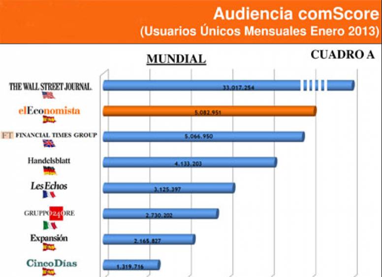 elEconomista.es ocupa la segunda posición en el Ranking mundial de audiencia on-line de la prensa económica occidental, con 5.082.952 usuarios únicos, por detrás de The Wall Street Journal y por delante del Financial Times Group, según ComScore
