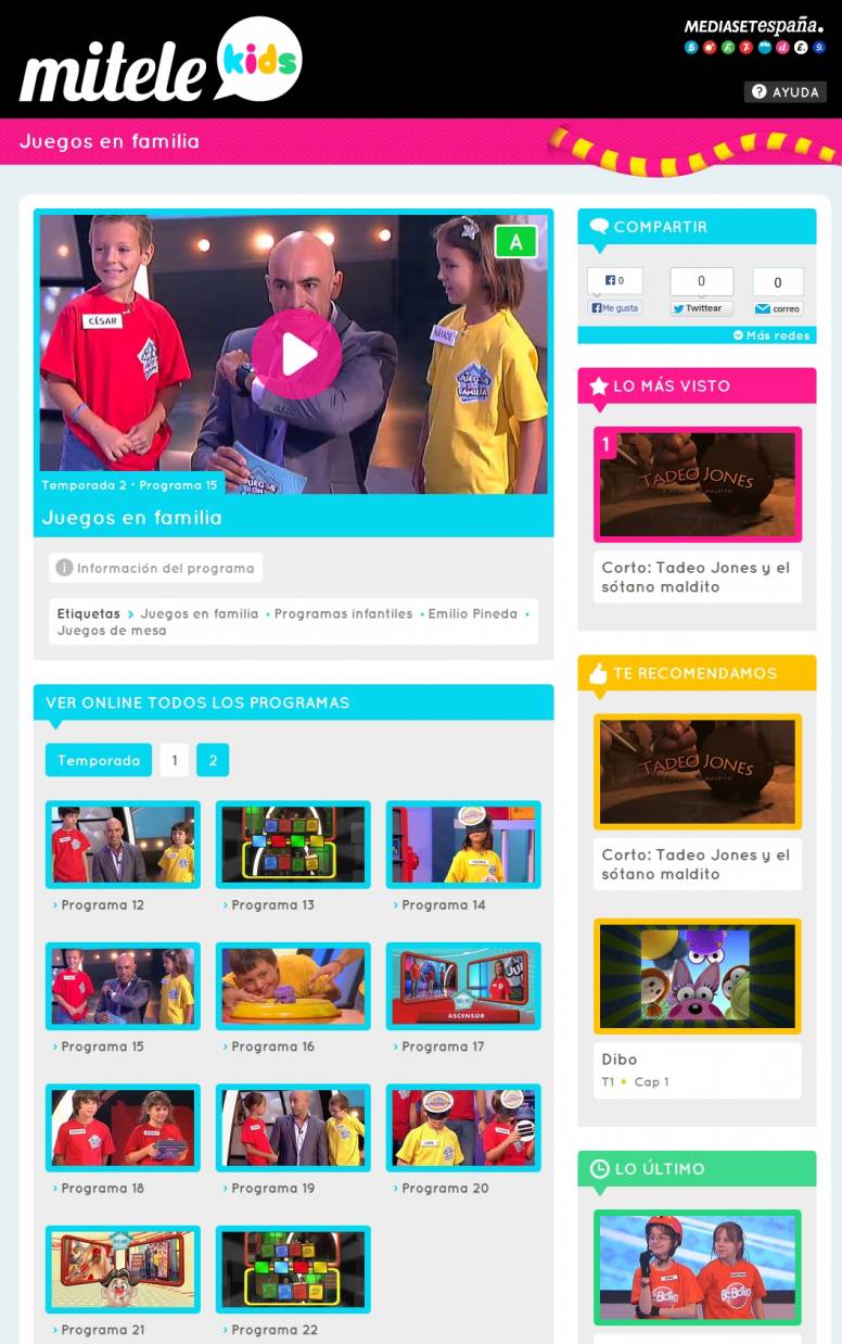 Mediaset España sigue apostando por los contenidos digitales a la carta poniendo en marcha la plataforma MiteleKids, que alberga contenidos para el público infantil, susceptibles de ser consumidos a la carta, de forma gratuita y desde diferentes plataformas (PC, tablets y smartphones). Este proyecto es una variante especializada de su plataforma generalista Mitele (www.mitele.es), que ya goza del reconocimiento unánime de los usuarios con más de 6.000 horas entre 180 contenidos diferentes. Además, la web Mitele.es acumula más de 4,5 millones de usuarios mensuales, supera los 300.000 usuarios diarios y los 100 millones de páginas vistas al mes, mientras que la app de Mitele para smartphones y tabletas acumula a día de hoy más de 753.000 descargas, alcanzando la marca un amplio seguimiento en redes sociales con casi 27.000 fans en Facebook y 40.700 seguidores en Twitter.