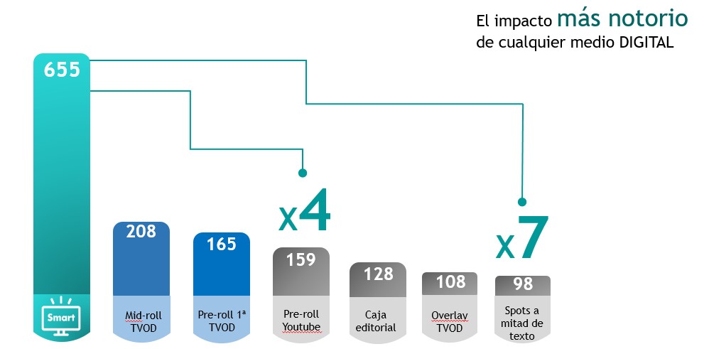 El spot en vídeo en Smart TV es el formato publicitario de mayor notoriedad del ecosistema digital, según el tracking de notoriedad publicitaria del instituto de investigación CIMEC, que le entrega un índice de recuerdo que multiplica por 6,5 veces el recuerdo medio de Internet y por 4 el pre-roll en Youtube. El visionado en pantalla grande, con el audio activado, publicidad no saltable y baja saturación publicitaria son los factores de tan elevado recuerdo, a lo que se suma la gratuidad del servicio, como factor de influencia en la percepción positiva de los espectadores. Todo ello, además, en un entorno seguro para usuarios y marcas.