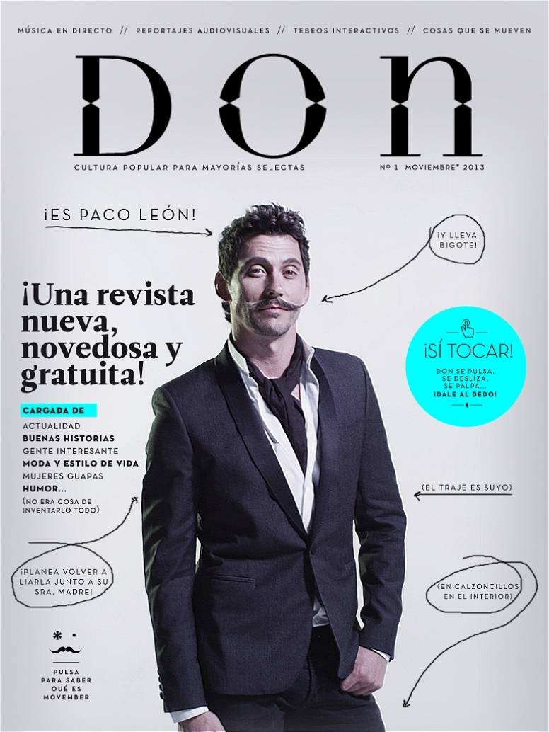 El popular actor Paco León protagoniza la portada del primer número de Don, que ya se puede descargar desde los quioscos de Apple y en breve desde Android. León avanza contenidos de su nueva aventura cinematográfica, habla de sus inquietudes creativas y opina sobre cine y televisión. Además, se suman a la propuesta del primer número de Don la atractiva actriz Silvia Alonso (‘Tierra de Lobos’) posando en plena noche madrileña, y el mítico piloto Randy Mamola concediendo una entrevista. Los contenidos culturales y de estilo de vida se combinan con nuevos formatos como grabaciones en vivo de actuaciones musicales, infografías interactivas de última generación y contenidos audiovisuales con calidad de cine que vienen a configurar su oferta de “Cultura popular para mayorías selectas”