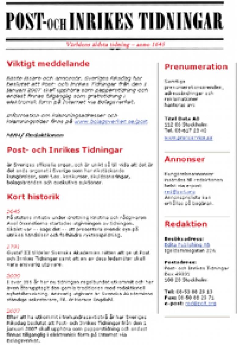 El 'Post Och Inrikes Tidningar', publicación oficial sueca para anuncios gubernamentales, de bancarrotas y compañías, se publica a diario desde 1645, lo que según la Asociación Mundial de Periódicos lo convierte en el más antiguo del mundo.