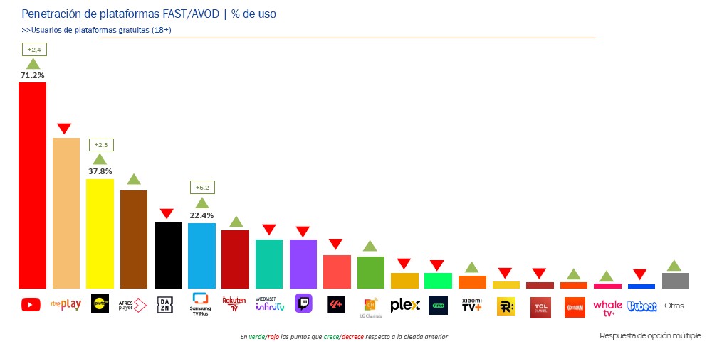 El estudio, basado en metodología CAWI sobre una muestra representativa de mil mayores de 18 años, analiza el consumo entre noviembre de 2025 y enero de 2026 y evalúa presencia, hábitos, experiencia publicitaria y valoración de contenidos en plataformas como YouTube, RTVE Play, Atresplayer, Pluto TV, DAZN, Rakuten TV, Samsung TV Plus, Twitch o Mediaset Infinity, entre otras.