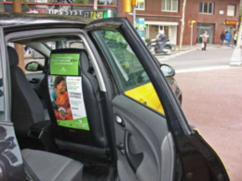 La acción ha sido posible gracias a un nuevo soporte publicitario para el interior de los taxis lanzado por Media-image que ya han utilizado marcas como Vodafone, American Express, Continental Airlines o Amena. Consiste en una funda de quita y pon que en este caso soporta una fotografía de una mujer india con un bebé en brazos e invita a los pasajeros a realizar un donativo a Intermon a través de un sms.