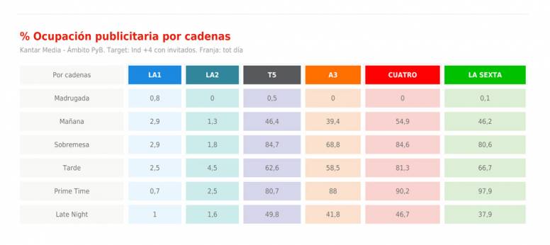 En este mes de marzo ninguna cadena ha sobrepasado el límite legal de 12 minutos de publicidad por hora. La que más se ha acercado ha sido La Sexta durante el prime time, horario en el que ha alcanzado el 97% de la ocupación permitida.