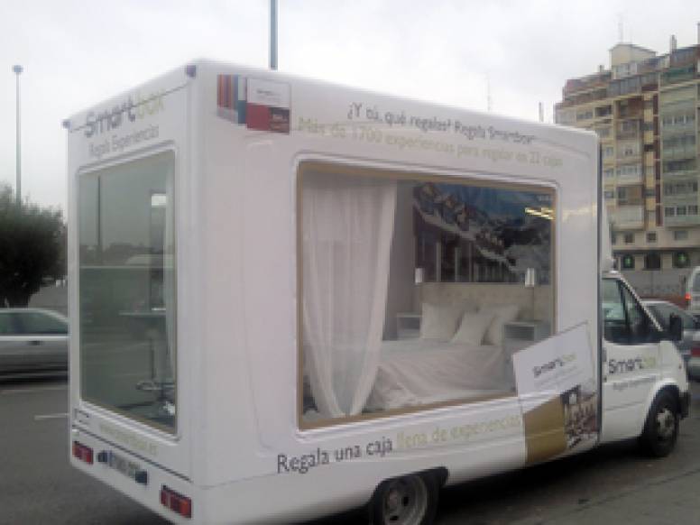 Dos vehículos acristalados propiedad de Improe vehículos promocionales, realizarán una ruta estas navidades por Madrid y Barcelona para la campaña de promoción en puntos de venta de Smartbox. Dos personas en cada uno de los vehículos se encargan de atraer la atención, desde el interior de la caja, por diferentes paradas.