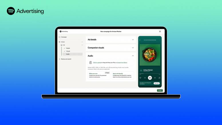 - Spotify Gen AI Ads. Spotify aporta su experiencia de décadas en IA y un enfoque innovador a sus socios publicitarios, permitiéndoles generar guiones y locuciones sin coste adicional, lo que facilita la creación de anuncios de audio escalables y de alta calidad. Los anuncios de IA generativa están disponibles para los anunciantes de Estados Unidos y Canadá en Spotify Ads Manager.