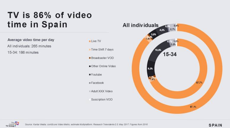 Resiliencia: A lo largo de la pasada década, la TV ha demostrado ser extraordinariamente resistente en una era de inmensa disrupción. A pesar de la aparición del desarrollo de nuevos servicios de SVOD, como Netflix, y la llegada de plataformas online como Youtube, el consumo de la TV se ha mantenido firme en todo el mundo. En España, la media de tiempo que se pasa delante del televisor ha aumentado 12’ en la última década, hasta las 3 horas y 51 minutos.