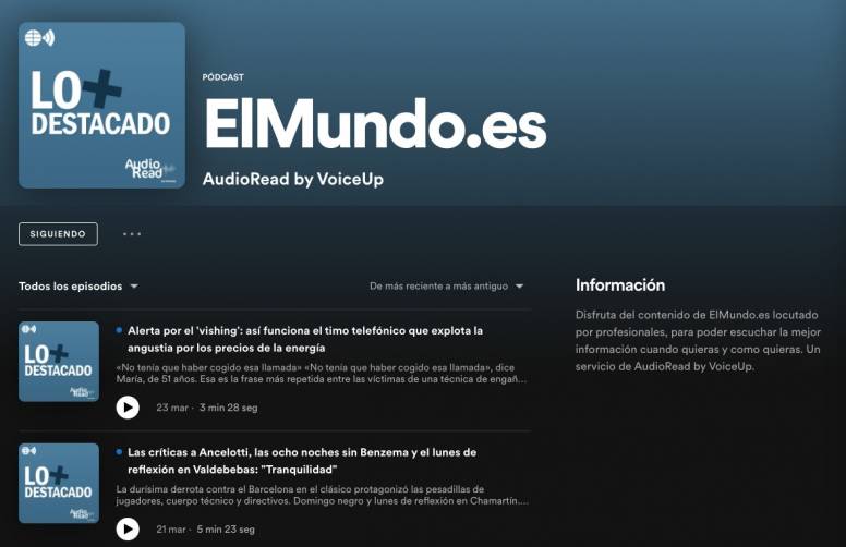 La infraestructura técnica, asistencia y gestión de las locuciones del nuevo servicio, así como el alojamiento, distribución y las métricas de cada audio, estarán gestionadas por el equipo de VoiceUp. Así, la compañía entra en el universo del audio en medios de comunicación con uno de los grupos editoriales referentes en España, con el objetivo de ofrecer a los lectores de El Mundo una manera fácil, sencilla y cómoda de estar informados desde cualquier lugar, en cualquier momento y desde cualquier dispositivo, además de ofrecer a los anunciantes un espacio nuevo y exclusivo para clientes que quieran llegar a sus lectores/oyentes. T