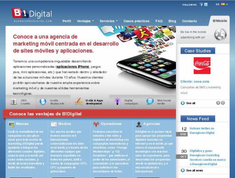 Buongiorno!Digital (B!Digital), división de marketing móvil del Grupo Buongiorno, ha puesto en marcha la versión en español de su nuevo portal en Internet, es.buongiornodigital.com, que recoge toda su oferta de servicios de marketing y publicidad digital. El cambio de nombre y de imagen comenzó el pasado mes de noviembre en España, Italia y Reino Unido. Desde el nuevo, las empresas operadoras, las agencias de publicidad, los medios de comunicación y los anunciantes pueden acceder a los servicios ofertados por B!Digital, al archivo de casos de usuario y a un Marketplace que permite a los clientes mantener el control sobre las campañas en internet móvil mediante los formatos ‘Performance’ y ‘Premium’.