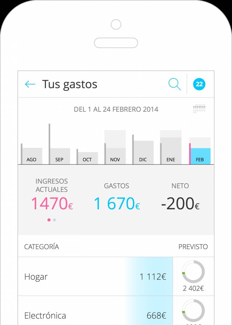 Fintonic organiza por categorías los gastos e ingresos de todas las cuentas y tarjetas para que en cualquier momento el usuario sepa en qué gasta y cómo evoluciona mes a mes.