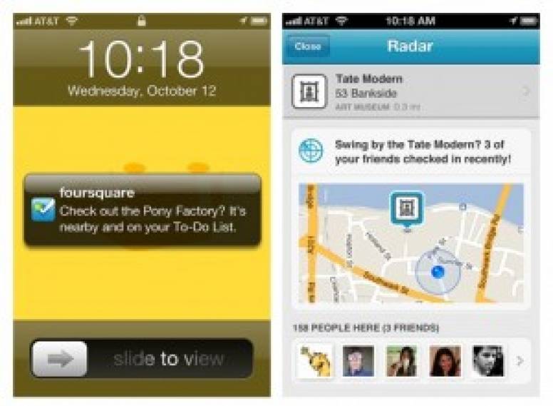 La última actualización que Foursquare ha llevado a cabo ha servido para poner en marcha la función Radar. Una nueva funcionalidad que se queda permanentemente activa por defecto en los terminales móviles de los usuarios y que les avisa sobre un evento o lugar de interés cuando está sucendiendo a su alrededor o en las proximidades, a través de una notificación.