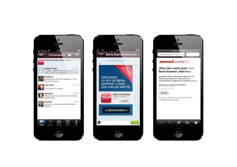 Iberia ha optado por emplear los nuevos formatos en el canal móvil para arropar el lanzamiento de su app Iberia Express. La firma ha apostado por el formato “Sponsored Chat” (“Chat patrocinado”) dentro de la plataforma Yuliop, un desarrollo tecnológico para smartphones que permite realizar llamadas internacionales y enviar SMS gratis. este formato permite a los anunciantes promocionarse a través de yuilop vía mensajes dentro de la aplicación y llegar a toda la audiencia de la aplicación.