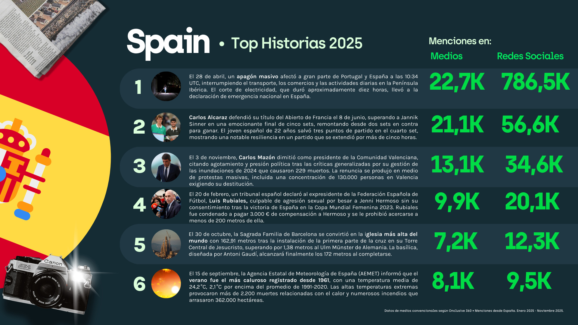 El análisis de Onclusive dibuja así un 2025 marcado por la política internacional, los conflictos bélicos y, en el caso de España, por una combinación de crisis, deporte y actualidad institucional.