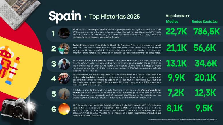 El apagón del 28 de abril, los éxitos deportivos de Carlos Alcaraz y el caso de Carlos Mazón concentran el mayor volumen de conversación en España durante 2025 en redes sociales y medios de comunicación. Así lo recoge el análisis anual realizado por Onclusive, que ha estudiado las menciones generadas a lo largo del año.