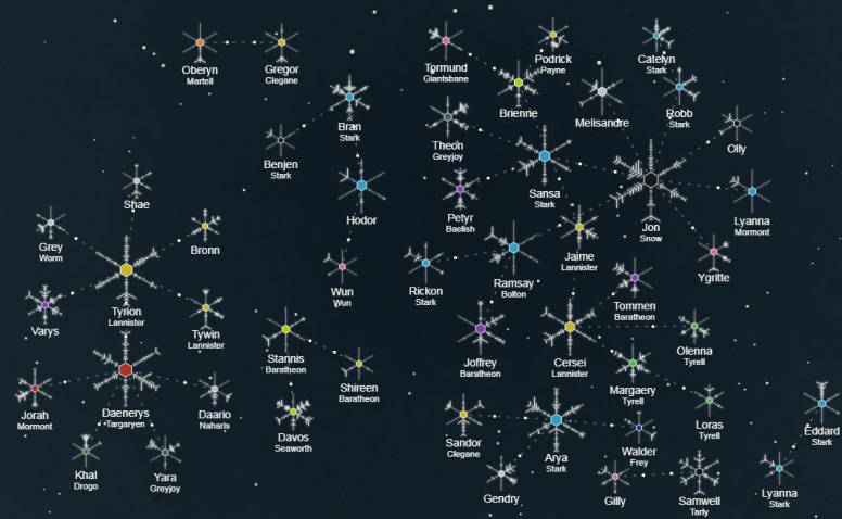 Además, el equipo de Twitter Data ha diseñado un gráfico interactivo con los momentos más grandes que ha vivido cada personaje hasta el momento. cada personaje de #GameofThrones es un copo de nieve y cada rama es una temporada, y cada marca en la rama es un episodio cuyo tamaño varía según la cantidad de Tweets que se han publicado sobre ello. Al hacer clic en un personaje (en un copo de nieve), se puede ver el momento más importante de este personaje en la serie (sobre lo que más se ha tuiteado) con el recordatorio de la temporada y el episodio en el que tuvo lugar este momento.