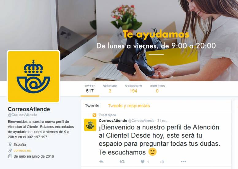 Correos, consciente de que los usuarios son cada vez más exigentes con el servicio que reciben, ha creado un nuevo canal de atención al cliente en Twitter (@CorreosAtiende), a través del cual atenderá de forma inmediata y, sin necesidad de acudir a una oficina, todas las dudas de sus usuarios, con un servicio personal y enfocado a las necesidades de cada cliente.