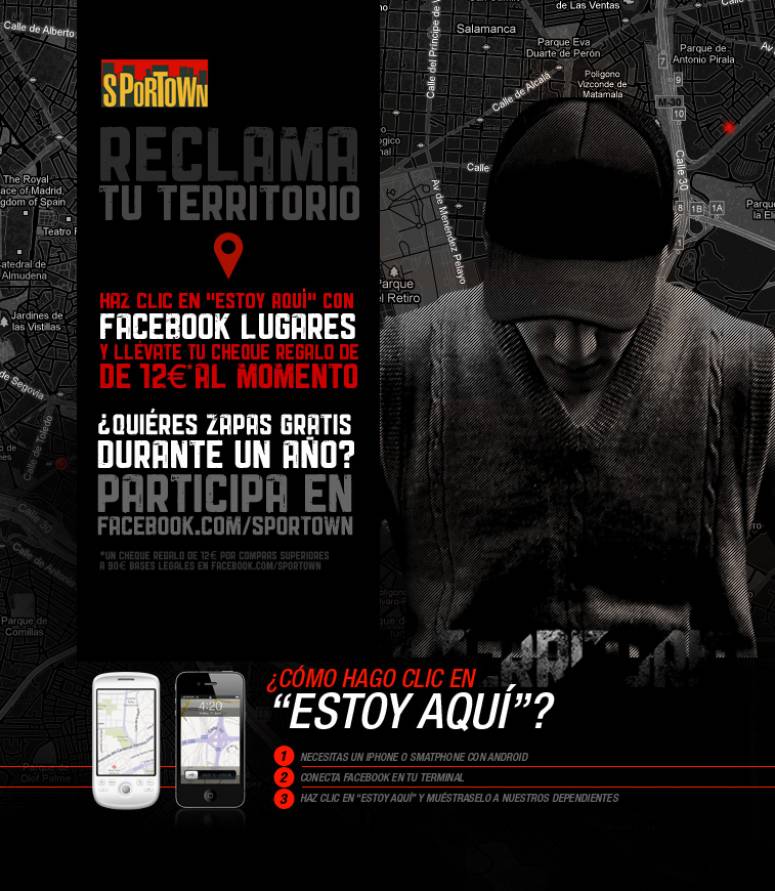 El Corte Inglés es la primera compañía española que combina la experiencia real de compra con las redes sociales empleando el servicio de geolocalización de Facebook ‘Lugares’. El objetivo de la compañía es ofrecer un cheque regalo por importe de 12 euros (por compras superiores a 90 euros) a los clientes de ‘Sportown’ y ‘Tiendas de Moda Joven El Corte Inglés’ al hacer check-in con 'Facebook Lugares' en sus tiendas.