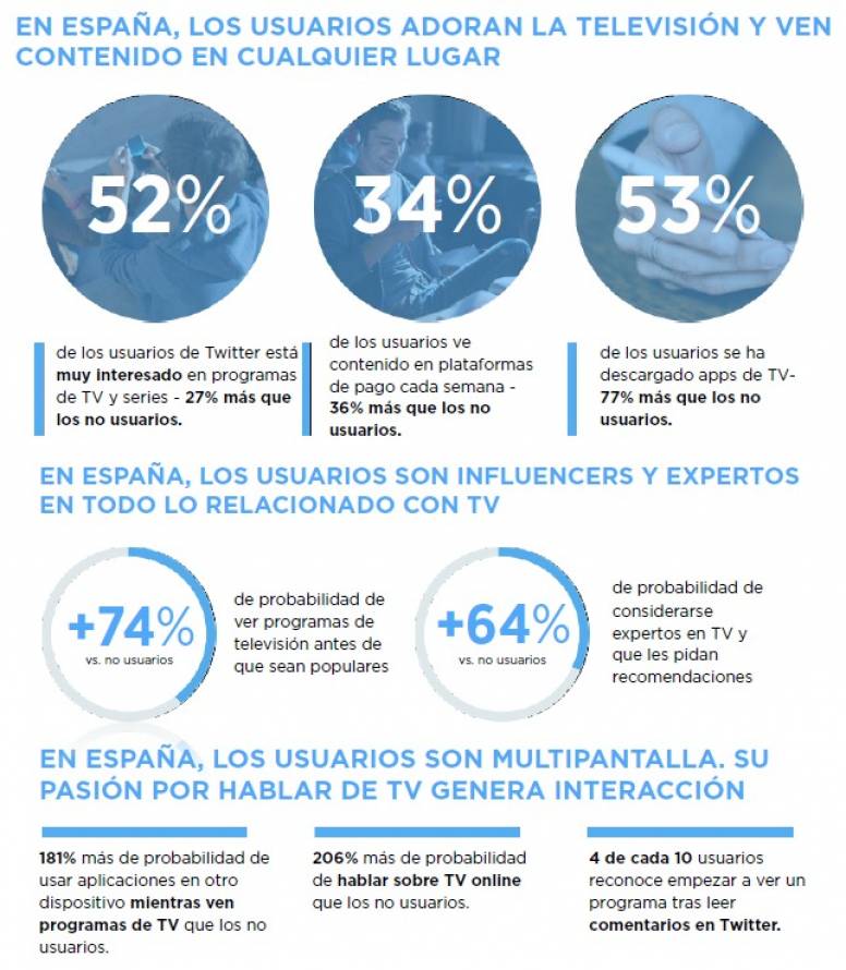 El estudio pone de relieve que se cual sea el momento del día, siempre hay usuarios compartiendo comentarios en Twitter sobre programas o emisiones de televisión. Concretamente el 52% de los usuarios de Twitter en España muestra un gran interés en los contenidos de televisión (un 27% más que los no usuarios). Y no solo eso, sino que además, hablan regularmente sobre televisión y buscan contenido más allá de las plataformas tradicionales: ven avances exclusivos, adoptan los servicios on-demand, los votos online y las aplicaciones móviles relacionadas con la televisión.