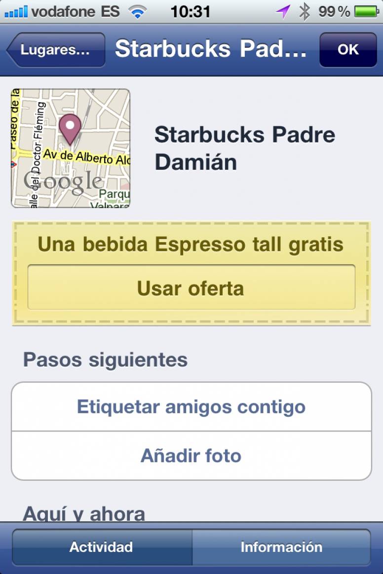 Facebook ha anunciado la disponibilidad en España de Facebook Ofertas, un servicio que permite a los usuarios de la plataforma acceder a descuentos especiales y ofertas. De este modo, si vas por la calle y buscas un restaurante, puedes consultar en tu móvil si hay alguna oferta por esa zona y disfrutar de los descuentos; de manera que el nuevo servicio ayudará a las empresas a ser más sociales y a impulsar sus negocios. Para el lanzamiento han contado con la participación de partners como, El Corte Inglés en sus establecimientos Sport Town, el grupo BBVA, Starbucks, Sol Meliá, Clinique Fútbol Club Barcelona, y ya está disponible desde hoy para todas las operadoras y dispositivos iPhone, Android y a través del touch site, touch.facebook.com.