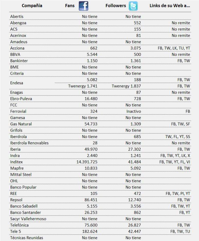 Ymedia realiza un informe sobre la presencia en las redes sociales de todas las empresas del Ibex35, midiendo su número de fans y seguidores (tabla de datos en la imagen), comprobando en qué redes tienen presencia, cuál es su nivel de actividad y verificando si remiten a sus sitios sociales desde sus páginas web oficiales.