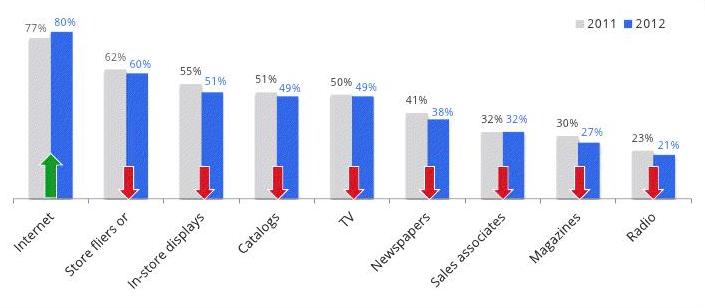 Un tercio de los consumidores dicen que Internet podrá influir a la hora de decidir el tipo de regalo, la marca o tienda en la que comprar. Para comprar precios, los motores de búsqueda y los e-commerce serán los más usados durante el periodo navideño de 2012. Cuatro de cada cinco usuarios de smartphones y tabletas los usarán en el proceso de compra. Los móviles serán más usados para encontrar tiendas y comprar precios; mientras las tabletas se usarán más para leer recomendaciones, y un 45% de los dueños de tabletas dicen que harán la compra desde el dispositivo móvil.