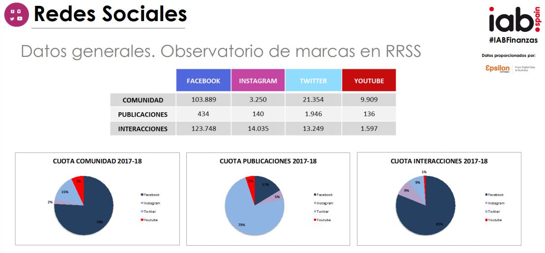 Datos generales de la repercusión de marcas financieras en las distintas redes sociales | Fuente: Observatorio de marcas en redes sociales IAB Spain