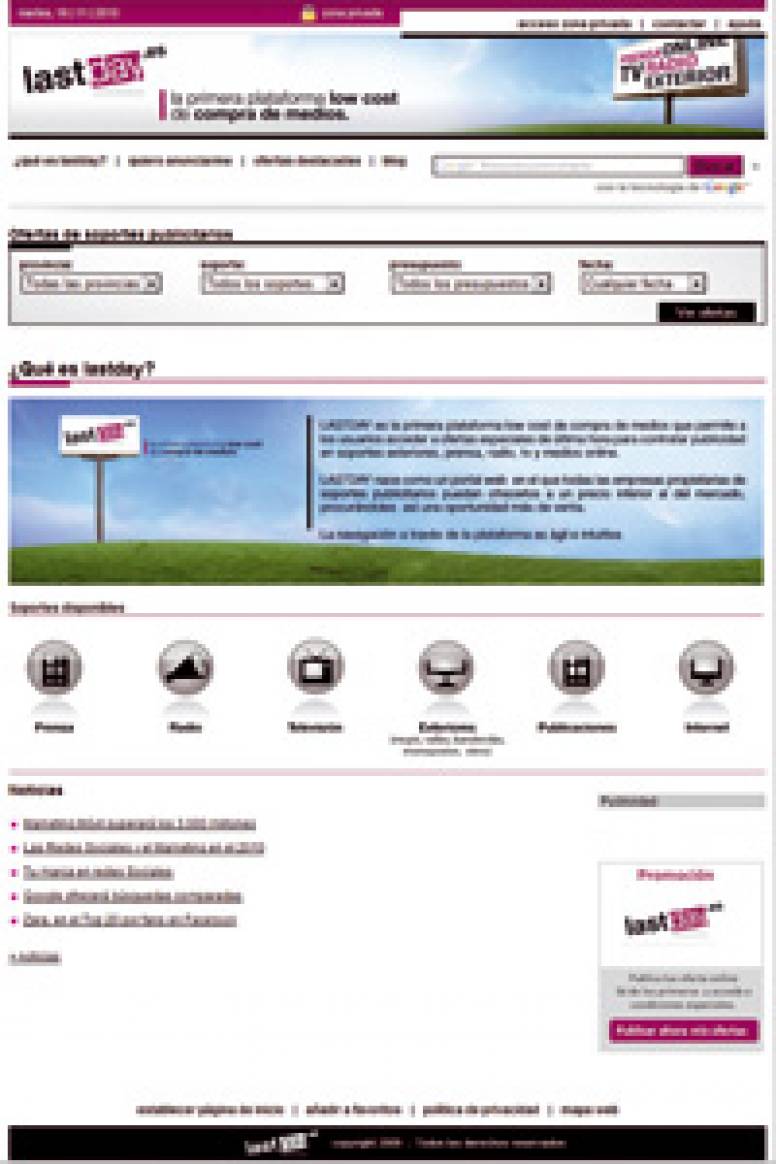 Lastday.es el nombre de la primera plataforma "low cost" de compra de medios lanzado en el mercado español. Un site que tiene por objetivo convertirse en un auténtico mercado de los medios, siendo punto de encuentro entre compradores y vendedores de espacio publicitario, independientemente del medio o canal que se trate. La novedad es que la plataforma permite a los usuarios acceder a ofertas especiales de última hora para contratar publicidad en soportes exteriores, prensa, radio, televisión y medios online. “Lastday nace con el objetivo de proporcionar una plataforma web en el que todas las empresas propietarias de soportes publicitarios puedan comercializarlos de manera efectiva y rentable, ya que el portal proporciona un nuevo canal de ventas en el que realizar ofertas agresivas de última hora para rentabilizar al máximo los diferentes soportes publicitarios –explica Raquel García, socia fundadora y directora de comunicación de la empresa- En ningún caso pretendemos sustituir a las tradicionales formas de venta, si no ofrecer una opción de comercialización nueva y complementaria para que los diferentes espacios tengan la máxima ocupación posible”.
