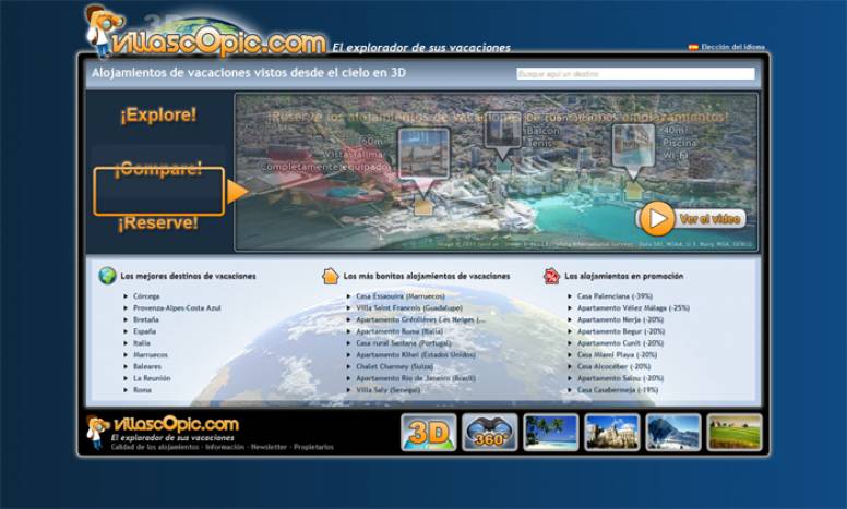 Villascopic (www.villascopic.com) es uan nueva website que, combinando aplicaciones geoespaciales, bases de datos turísticas y tecnologías web, permite explorar un destino de vacaciones y elegir su alojamiento “visto desde el cielo” y en 3D. El sitio web pretende así responder a las expectativas de los usuarios, ofreciendo una vista muy próxima a la realidad de la región explorada, como si pudiera verse desde un avión o un helicóptero, facilitando de esta forma la mejor elección.