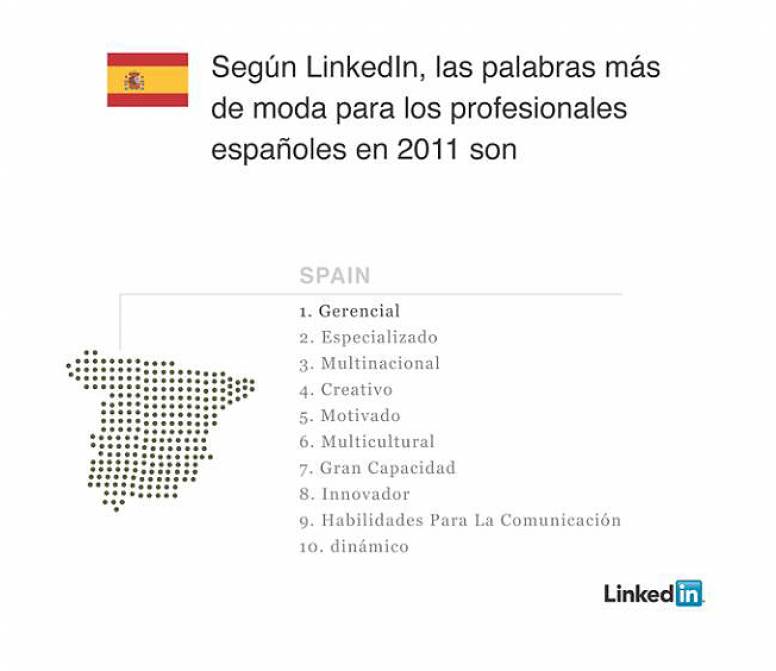En 2010 en España los términos más comentados eran “dinámico”, “innovador”, “con amplia experiencia profesional”, “motivado”, “proactivo”, “con gran capacidad para trabajar en equipo”, “orientado a resultados”, “emprendedor”, “con una trayectoria reconocida” y “con valor añadido”. A nivel global destacaban los atributos de “amplia experiencia”, “dinámico”, “motivado” e “innovador”, que fueron las expresiones más de moda en varios países. Ya que este año el número de miembros de LinkedIn ha crecido pasando de los 85 millones a los 135 millones, la lista también ha cambiado, no obstante el término “creativo” continua liderando las listas en muchos de los países.