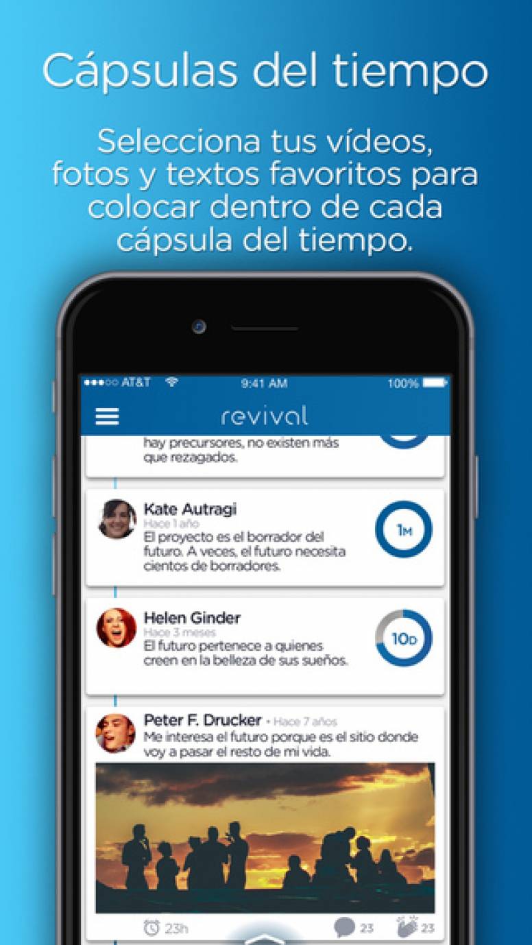 Tras un año en fase beta, la app Revival está de estreno. La aplicación permite de forma privada el envío de contenido digital (vídeos, fotos y textos) a los contactos que el usuario tenga en su agenda, para ser desvelado en el momento futuro que el usuario establezca, ya sea minutos, semanas, meses o incluso años; como si de una cápsula del tiempo se tratara.