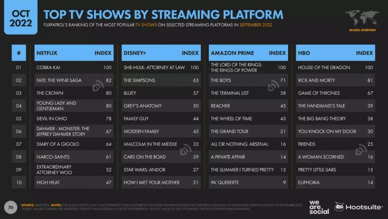 Según Hootsuite y Flixpatrol, las películas más vistas en septiembre en plataformas de streaming fueron: La villa del amor (Netflix), Thor: Love and Thunder (Disney+), Samaritan (Amazon Prime Video) y Elvis (HBO). Las series más vistas a nivel mundial fueron: Cobra Kai (Netflix), She-Hulk: Abogada Hulka (Disney+), Los Anillos del poder (Amazon Prime Video) y La casa del dragón (HBO).