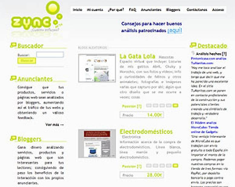 Zync es una plataforma web mediante la cual un anunciante, publicitario a agencia de medios puede contratar el análisis de los productos o servicios de una sociedad a través de blogs, clasificados por precio y categoría, según su popularidad e influencia. Bajo el lema “¿Cuánto influyes?”, esta herramienta pretende ser un ejemplo de cómo las compañías van creando y satisfaciendo nuevas necesidades en el creciente entorno de la empresa 2.0.