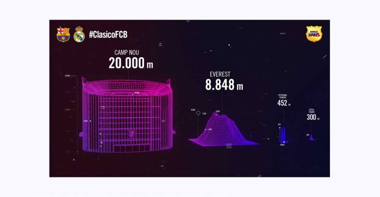 Teniendo en cuenta el número de personas que desearían poder ver el encuentro en el Camp Nou, el estadio se queda pequeño. Por eso el FC Barcelona ha imaginado junto a DoubleYou un estadio con cabida para toda la afición del mundo. Alrededor de 20 kilómetros de alto, 4.500 graderías y 200 millones de asientos acogerían el grito de ánimo de una afición que enmudecería el sonido de un cohete a reacción. Un lugar donde millones de seguidores del club aúnen sus voces en un solo grito de ánimo de cara al encuentro más importante de la temporada.