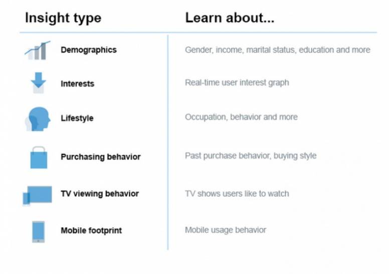 Conocer mejor a las personas y los mercados ayuda a los anunciantes a crear mensajes potentes que lleguen al público. Por eso, Twitter ha presentado la herramienta Audience Insights, para ayudar a las marcas a entender mejor a sus audiencias clave en Twitter. Gracias a esta herramienta, las marcas pueden descubrir información valiosa sobre sus seguidores y las personas que han interactuado con los tweets de la marca e identificar audiencias nuevas y relevantes a las que pueden dirigirse en campañas futuras. Además, el panel de audience insights proporciona información agregada sobre datos demográficos de los usuarios, sus intereses, y comportamientos de compra entre otros. Con esta información, no solo se puede identificar y segmentar mejor al público al que dirigirse con Twitter Ads, sino también saber qué tipo de contenidos creativos —como Vine o vídeo— son más atractivos para esta audiencia.