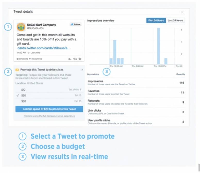 Twitter ha lanzado en España la función quick promotion, una nueva herrameinta enfocada a cubrir las demandas y necesidades de las pequeñas y medianas empresas, con el objetivo de hacer llegar su contenido a un mayor número de usuarios en Twitter. Según detallan desde el blog oficial, esta herramienta sirve para amplificar los tuits que mejor están funcionando directamente desde el panel de actividad: en sólo unos clics se selecciona el tuit a promocionar y automáticamente éste se segmentará para aquellos usuarios que tengan intereses similares a los de los seguidores de la compañía (la audiencia que es más probable que esté interesada en ese contenido).