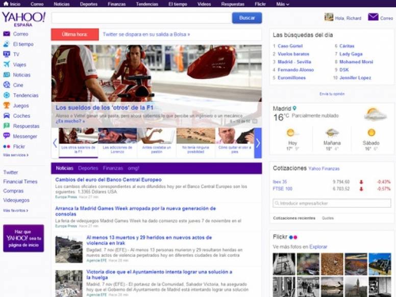 Con el objetivo de adaptarse y ponerse al nivel de la competencia de Google y las redes sociales, Yahoo ha lanzado su nueva portada. Moderna, aunque más familiar, la nueva portada ya está disponible en España, en Alemania, Francia, Italia, Reino Unido, Irlanda y Sudáfrica. Concretamente se ha renovado algunos de los productos más populares como la aplicación Yahoo Tiempo, o el nuevo look de Flickr adaptándose a las necesidades de los usuarios. Precisamente por eso, se creó Jerry and Dave’s Guide to the World Wide Web. Se trata de un directorio de links con el objetivo de ayudar a organizar internet de forma intuitiva y personalizada, ya sea para navegar por las noticias destacadas, mirar el correo, colgar fotografías, conocer la previsión meteorológica o incluso consultar nuestro horóscopo.